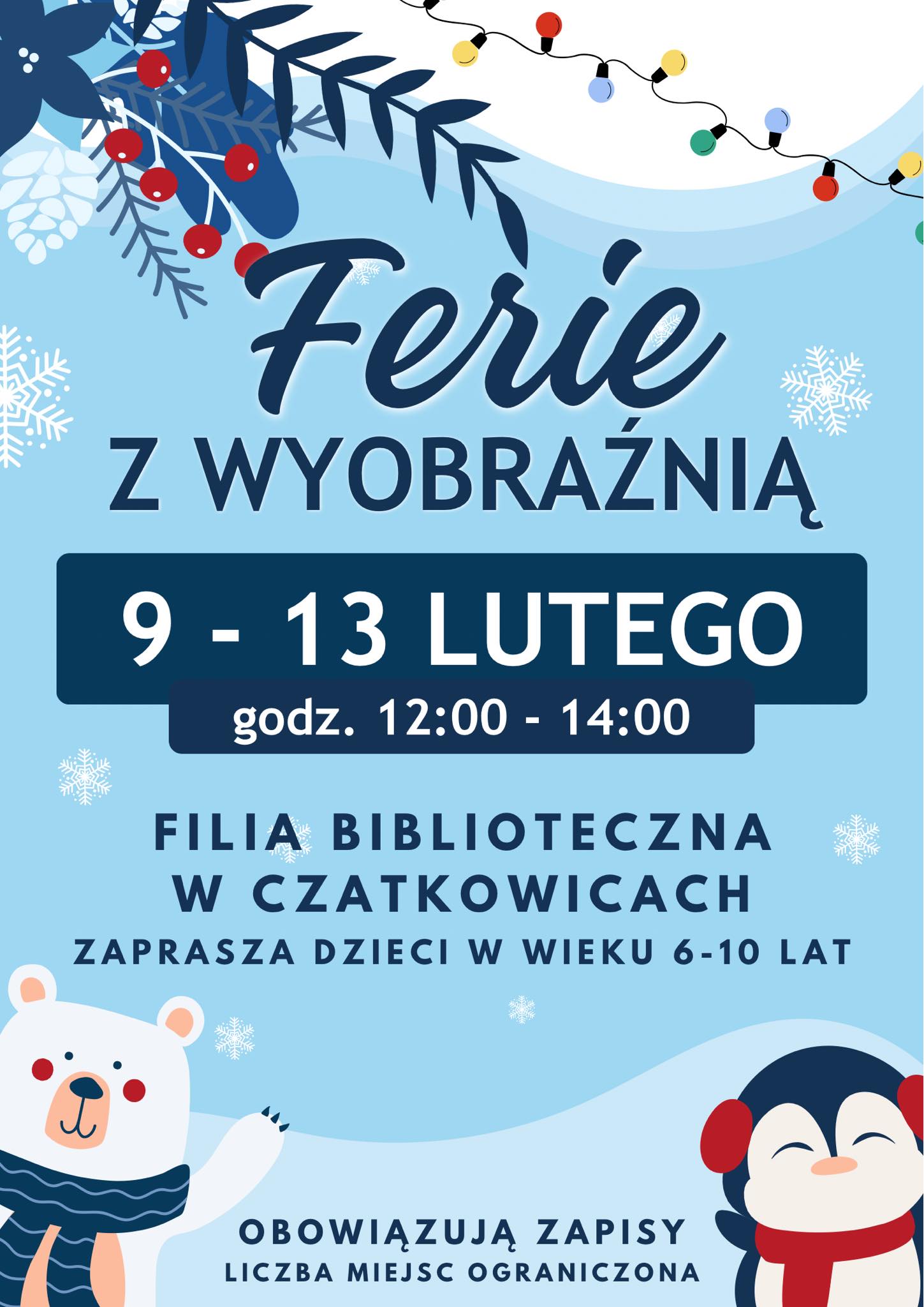 Filia biblioteczna w Czatkowicach zaprasza dzieci w wieku 6-10 lat do udziału w zajęciach pod hasłem „Ferie z Wyobraźnią” – od 9 do 13 lutego w godzinach od 12.00 do 14.00. Każdego dnia na...