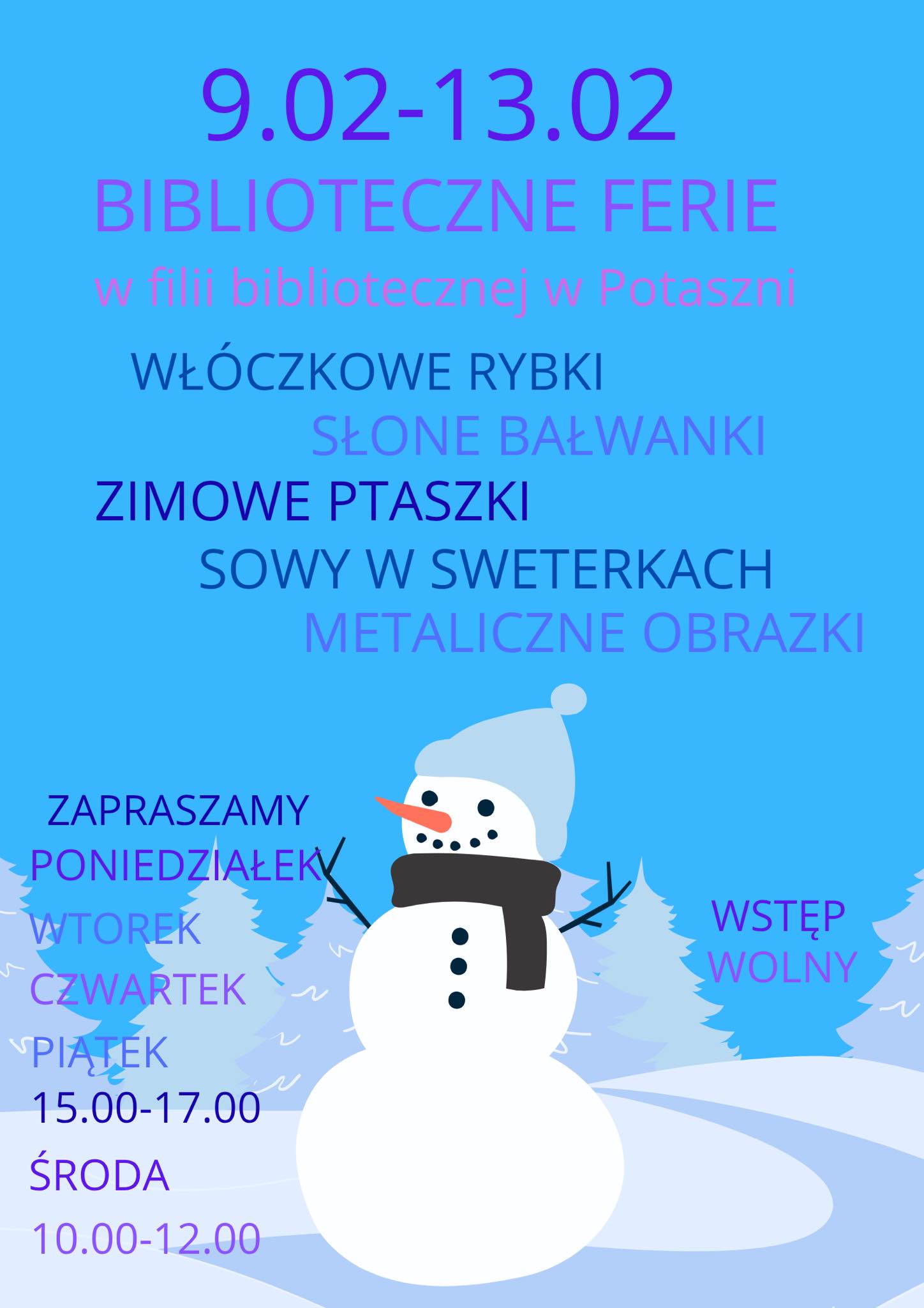 W dniach od 9 do 13 lutego filia biblioteczna w Potaszni zaprasza dzieci na „Biblioteczne Ferie”, czyli cykl zajęć przygotowanych z myślą o zimowym wypoczynku w twórczej i przyjaznej atmosferze. W programie przewidziano różnorodne...