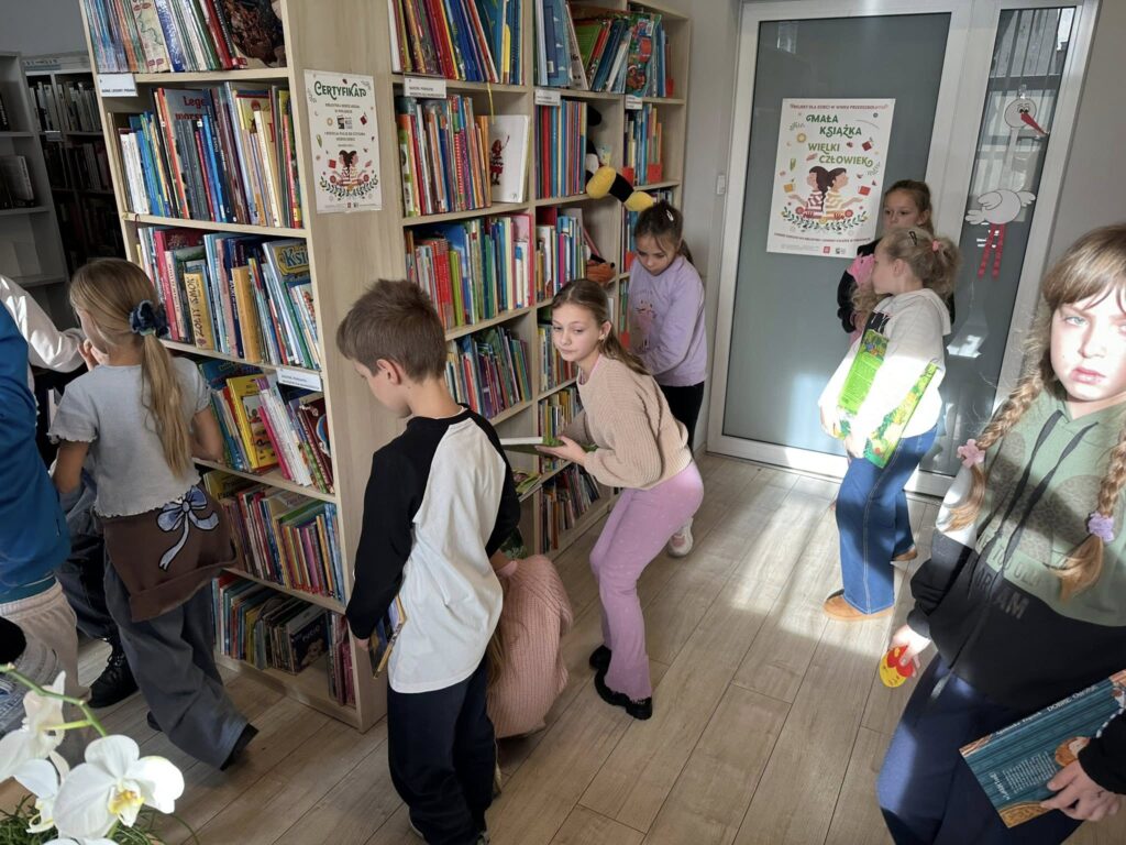 Na zakończenie spotkania przyszedł czas na ulubiony punkt każdej wizyty w bibliotece – „książkobranie”. Uczniowie z radością wybierali książki, które zabiorą ze sobą do domu, aby kontynuować przygodę z czytaniem.