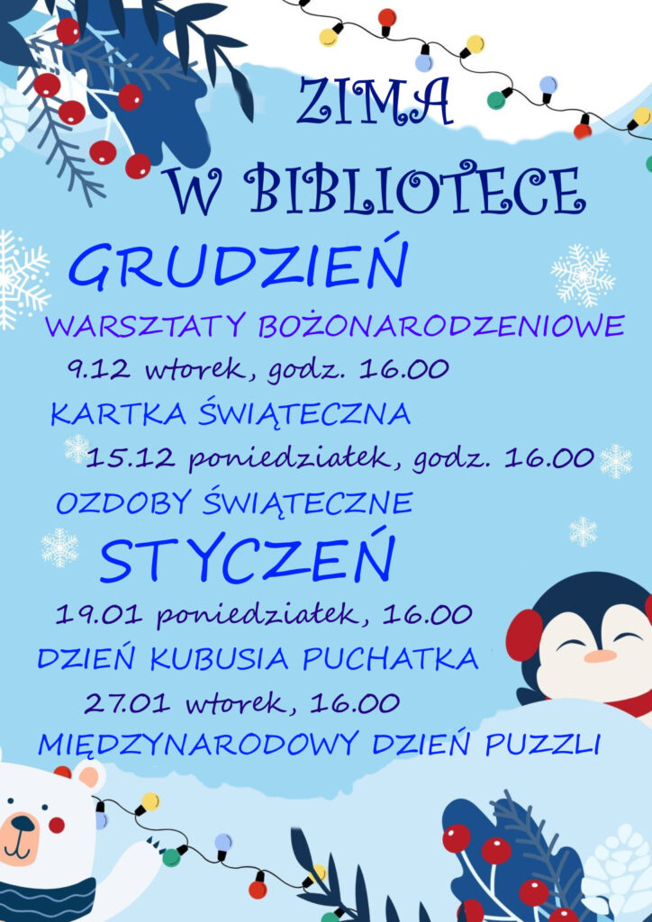 Zima w filii bibliotecznej w Potaszni zapowiada się naprawdę wyjątkowo. W grudniu i styczniu przygotowaliśmy dla dzieci cykl twórczych spotkań. Zachęcamy do udziału w zajęciach i spędzenia czasu w naszej bibliotece, w otoczeniu książek, inspiracji i świątecznej magii.