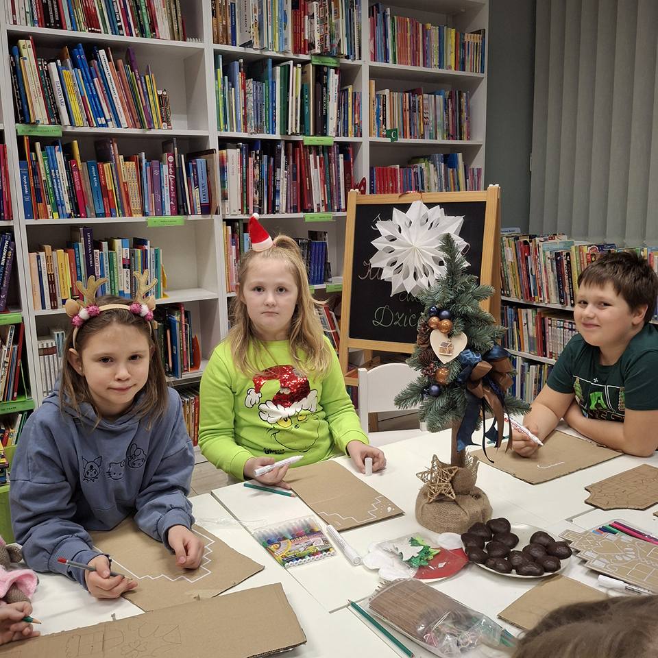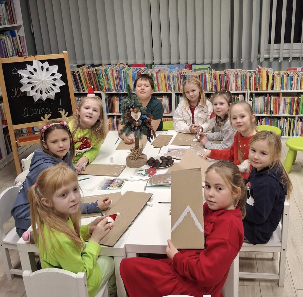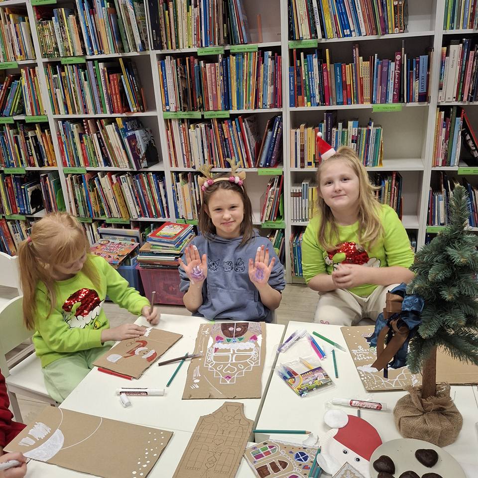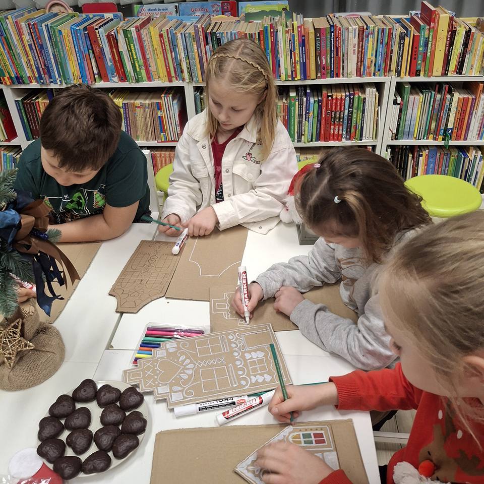 Po części czytelniczej dzieci z zapałem przystąpiły do tworzenia piernikowych domków. W sali zapanował prawdziwie bajkowy nastrój, a unoszący się zapach korzennych przypraw sprawił, że wszyscy poczuli nadchodzące święta jeszcze mocniej. W tle rozbrzmiewała delikatna świąteczna muzyka, która umilała wspólną pracę i rozmowy.
