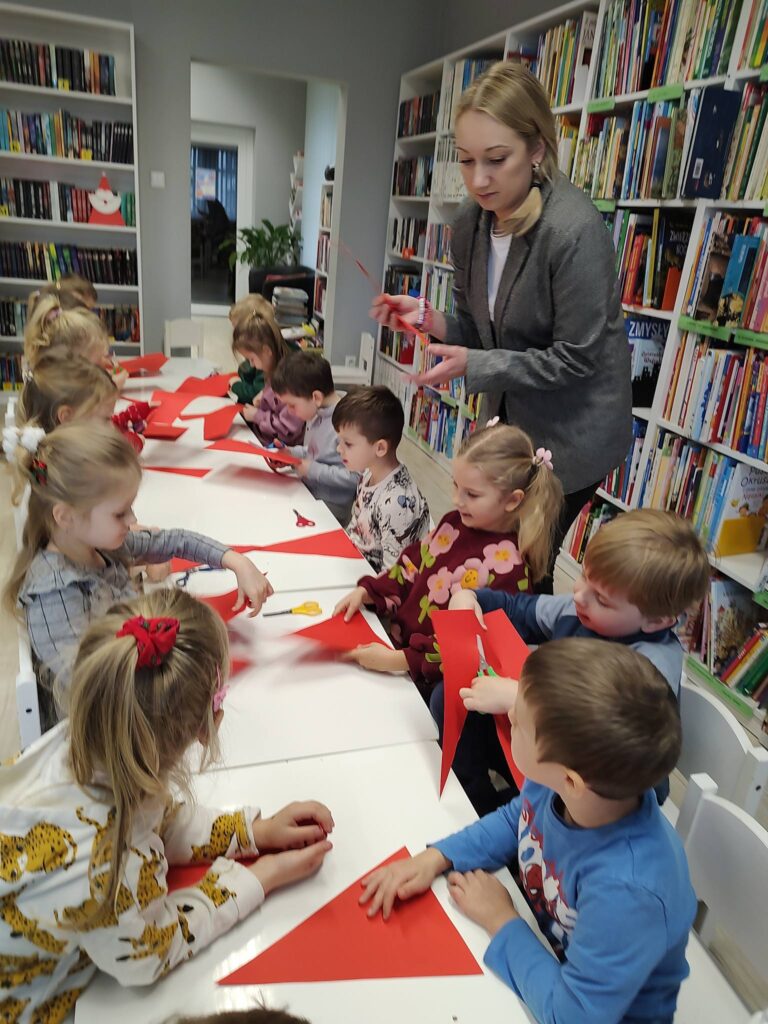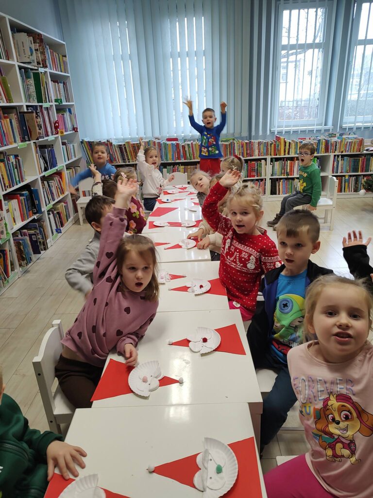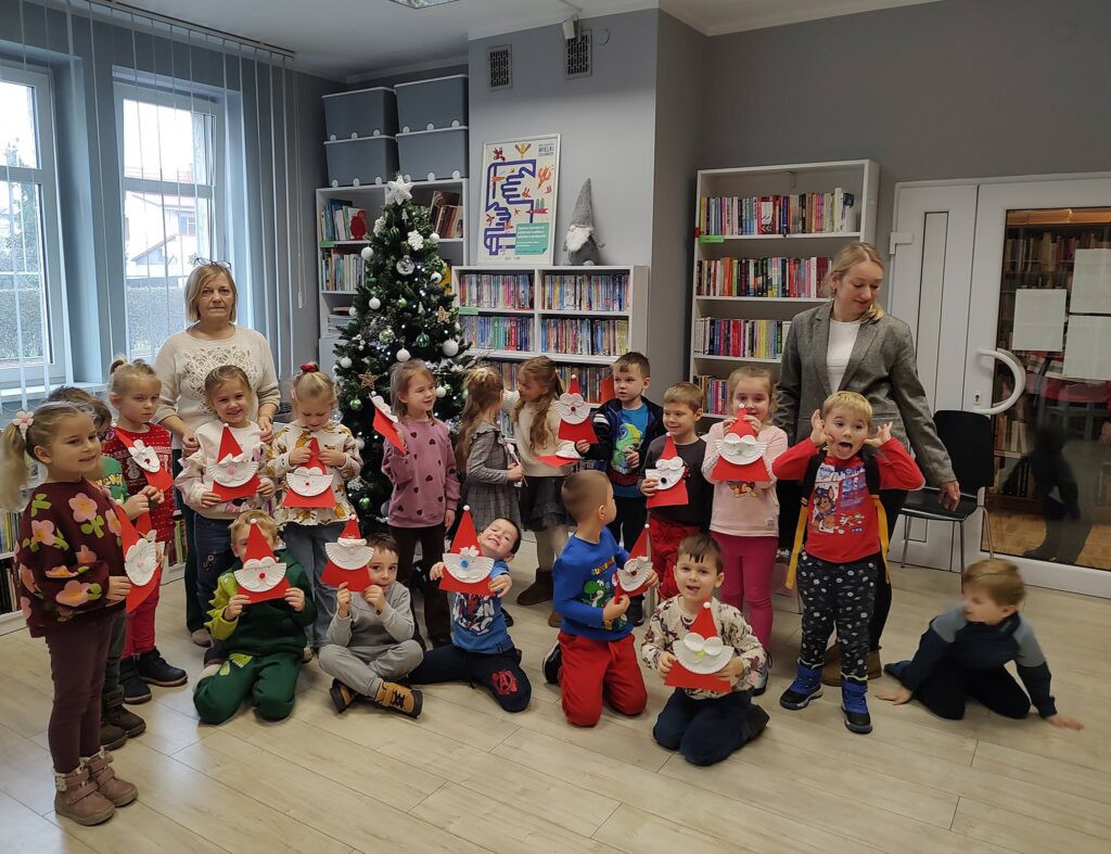 Przedszkolaki wysłuchały świątecznego opowiadania, rozwiązywały zagadki i z zaangażowaniem przygotowały papierowe postacie Mikołaja. W bibliotece zrobiło się kolorowo, radośnie i bardzo świątecznie – dokładnie tak, jak w tym wyjątkowym czasie powinno być. Spotkanie odbyło się 8 grudnia i przyniosło wszystkim wiele ciepłych, zimowych wrażeń.