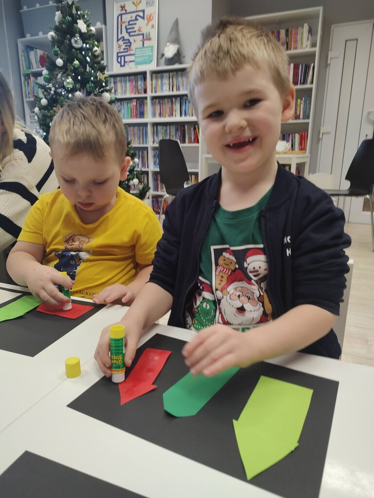 Po wspólnej rozmowie i wysłuchaniu bajki dzieci z zaangażowaniem przystąpiły do zajęć plastycznych, podczas których wykonały prace pod hasłem „Zima w mieście”. Była to doskonała okazja do rozwijania wyobraźni, kreatywności oraz sprawności manualnej.