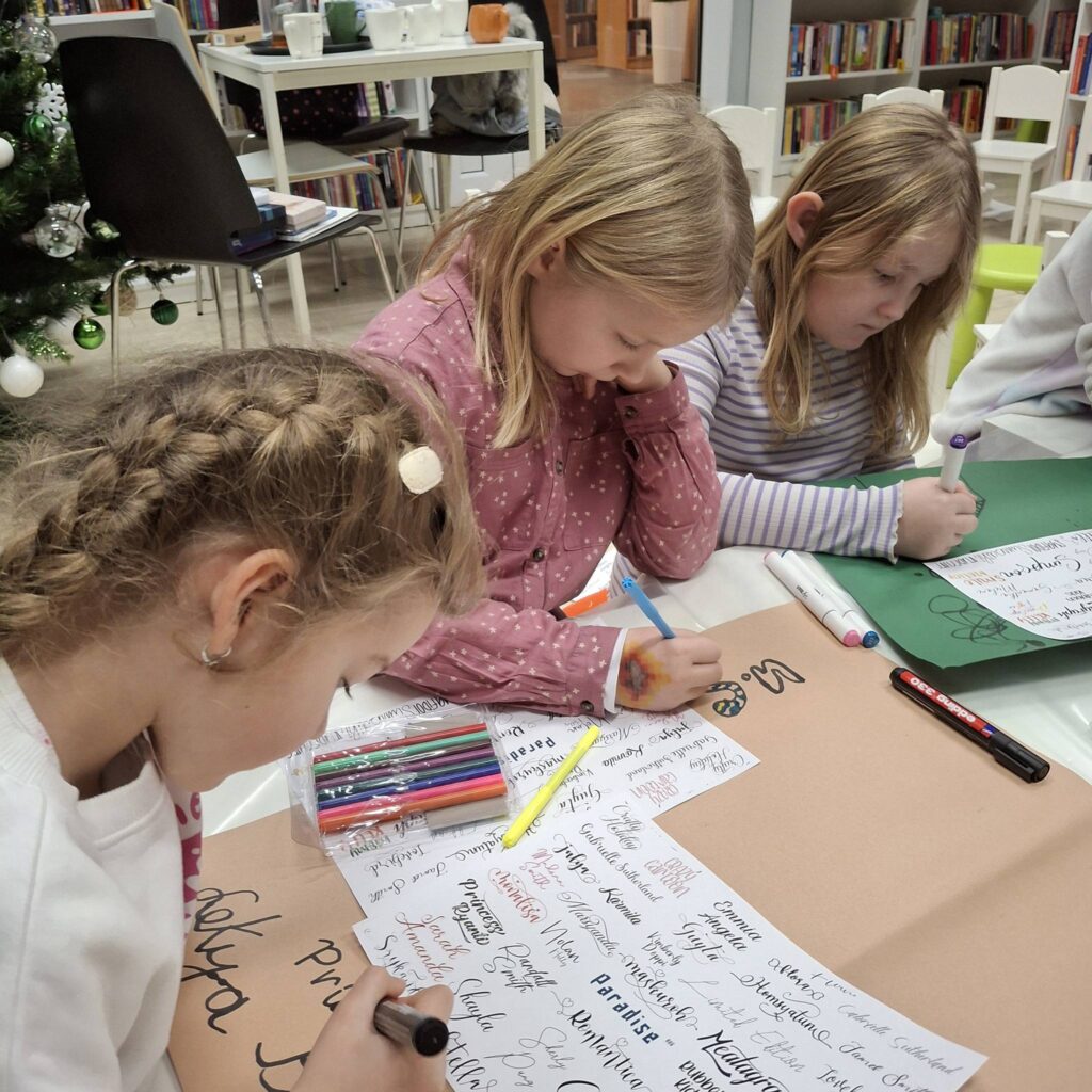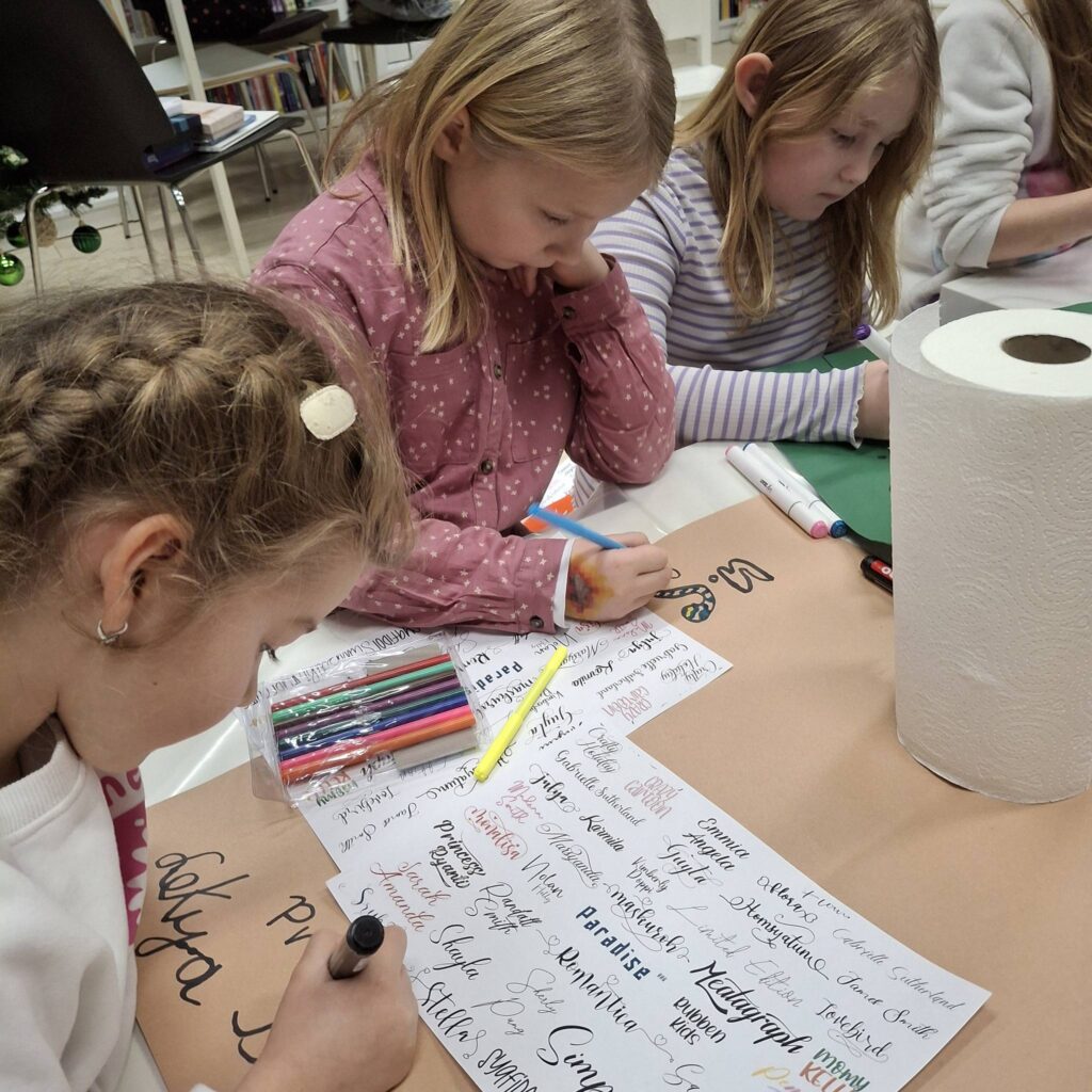 W drugiej części zajęć przeszliśmy do działań twórczych. Uczestnicy mieli okazję poznać podstawy kaligrafii oraz niezwykłe przybory do pisania. Największą atrakcją okazało się pisanie gęsim piórem – dzieci z entuzjazmem próbowały swoich sił, a na kartkach pojawiały się m.in. pięknie kreślone serca.