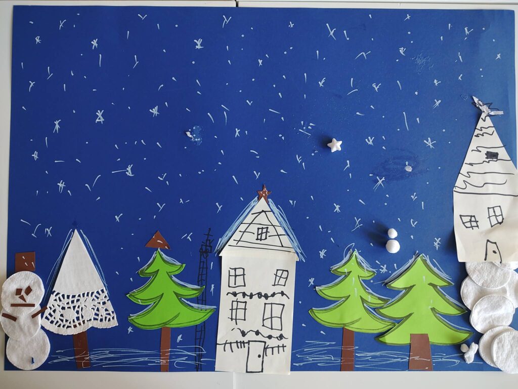 Kolejnym etapem spotkania były zajęcia plastyczne. Dzieci, zawsze chętne do twórczych działań, tym razem przygotowywały zimowe pejzaże. Przedszkolaki pracowały w trzyosobowych zespołach, dzięki czemu powstały ciekawe i różnorodne krajobrazy zimowe.