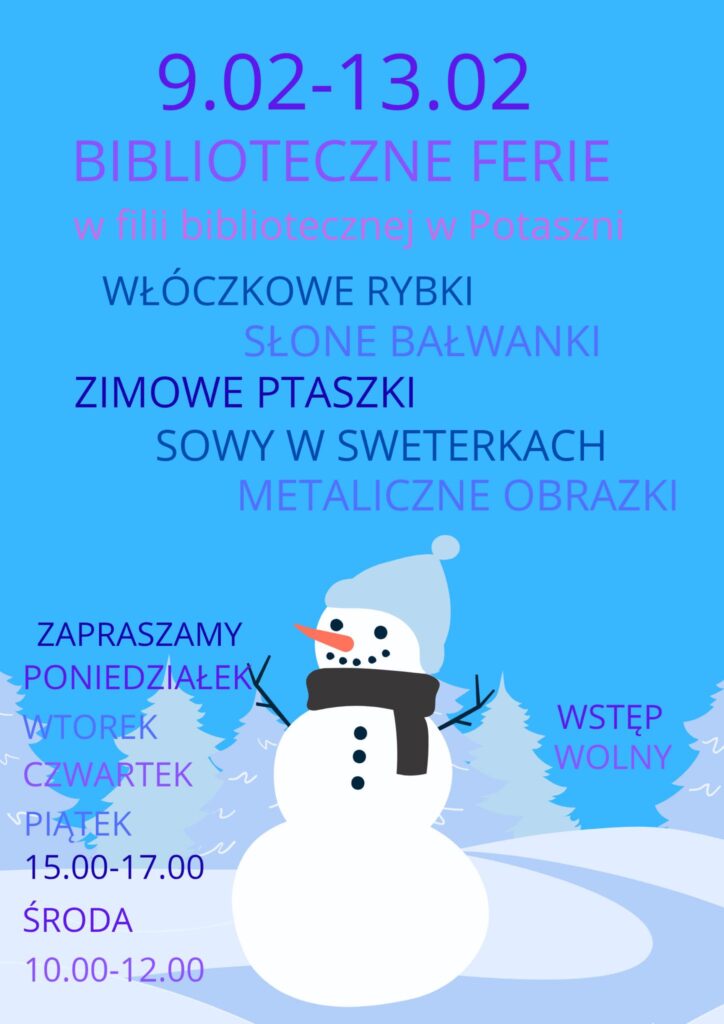 Serdecznie zapraszamy dzieci do wspólnego spędzenia ferii zimowych w filii bibliotecznej w Potaszni. To doskonała okazja, aby twórczo wykorzystać wolny czas, poznać nowe techniki plastyczne i spędzić ferie w bibliotece w miłej, zimowej atmosferze.