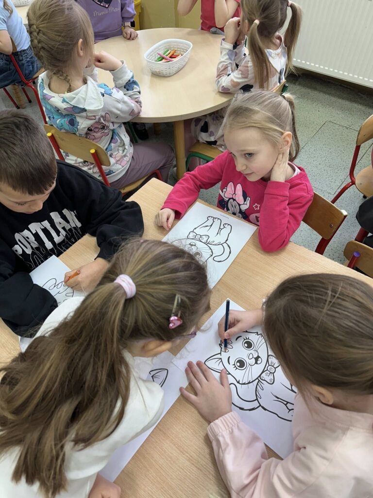 To właśnie ci dwaj bohaterowie pojawili się w czytanym podczas spotkania opowiadaniu pt. „O złotej rybce i kocich marzeniach”. Przedszkolaki z zaciekawieniem słuchały historii i wspólnie zastanawiały się, o czym mogą marzyć koty. Jakie były ich marzenia? My już wiemy, a wszystkich ciekawych zachęcamy do sięgnięcia po tę opowieść. Na zakończenie spotkania czekała na dzieci miła niespodzianka – każdy uczestnik otrzymał „kocią” kolorowankę. Spotkanie upłynęło w bardzo radosnej atmosferze i było kolejną okazją do wspólnego odkrywania świata książek.