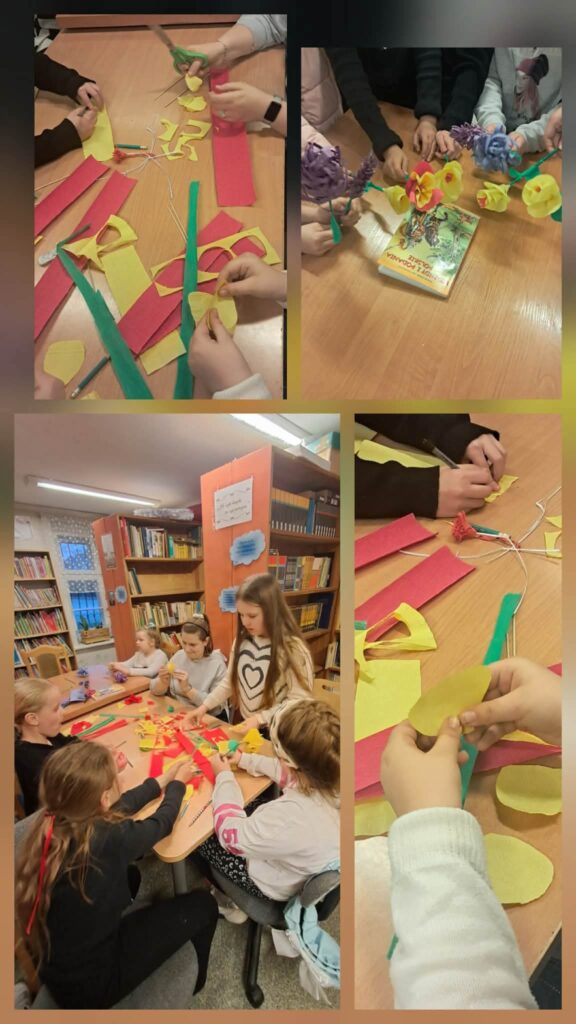 Nie zabrakło także twórczej pracy plastycznej. Jednego dnia dzieci przygotowały piękne laurki dla Pisarza i Pisarki, rozwijając swoją wyobraźnię i zdolności manualne. Podczas drugiego spotkania powstały ilustracje do legendy o Smoku Wawelskim, a także kolorowe wiosenne kwiaty z bibuły, które wprowadziły do naszej sali prawdziwie wiosenny nastrój.