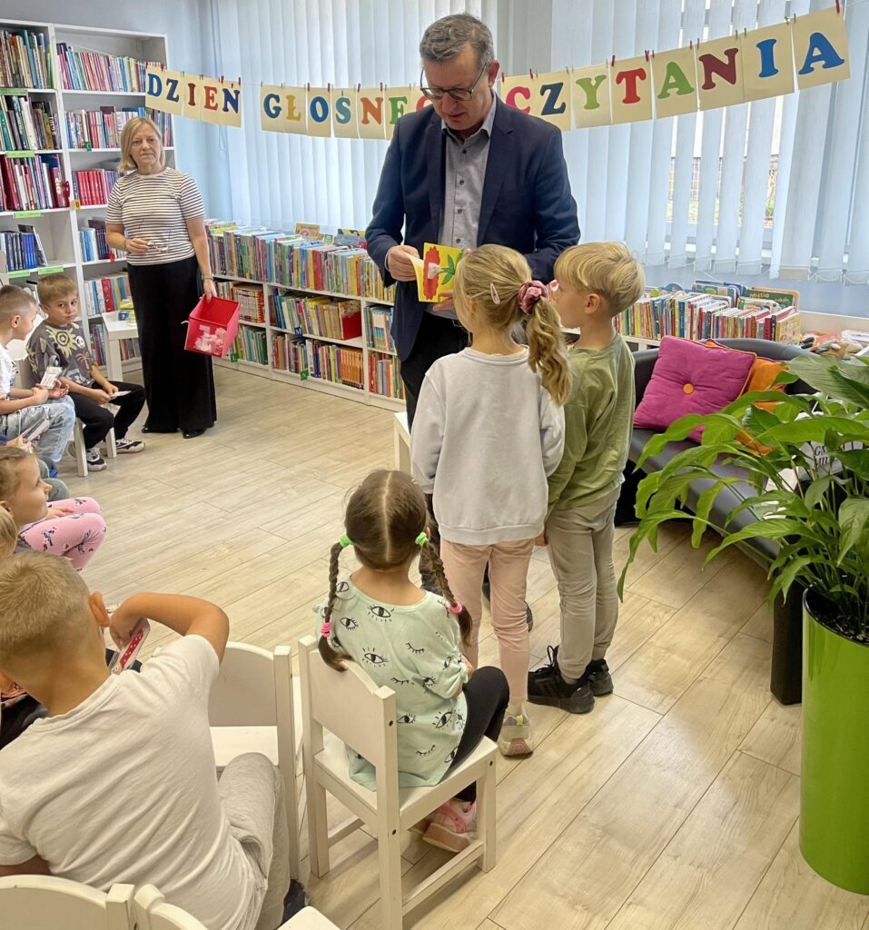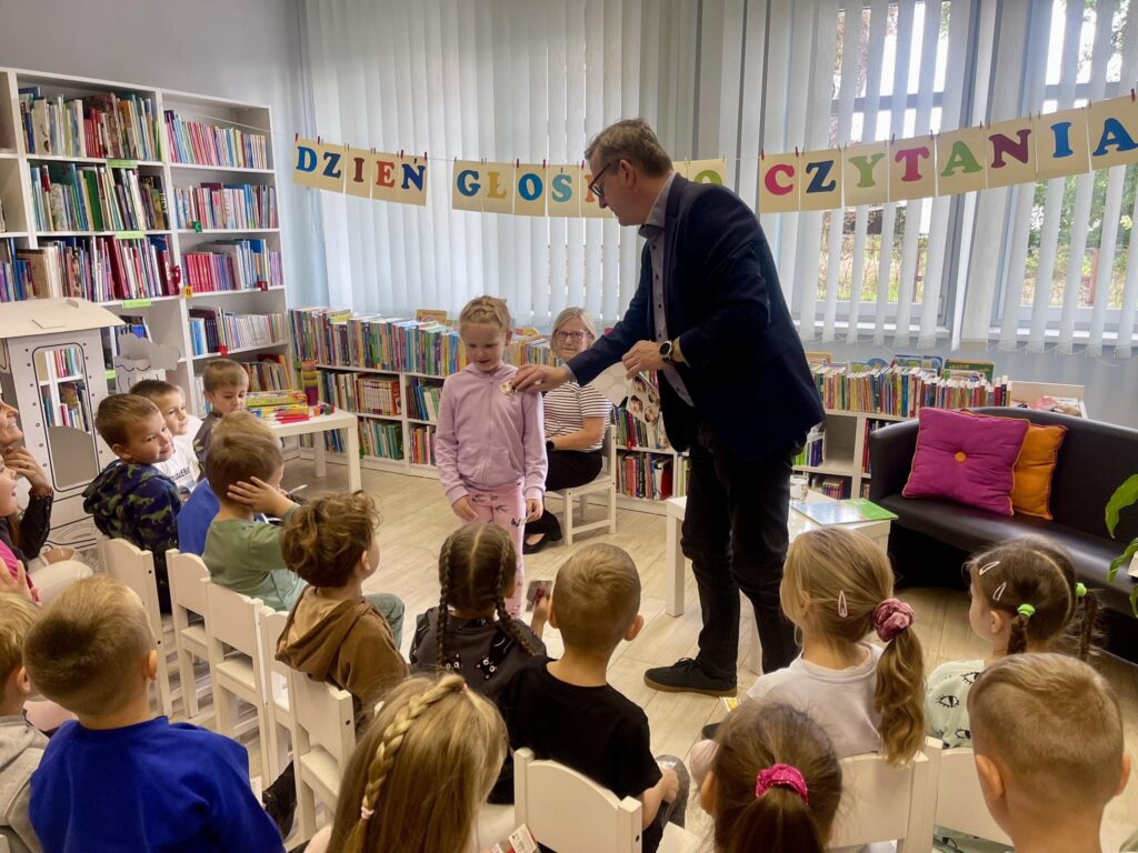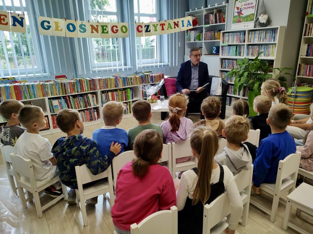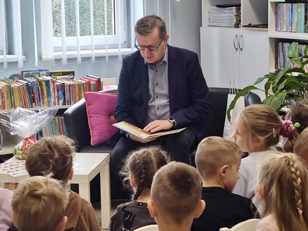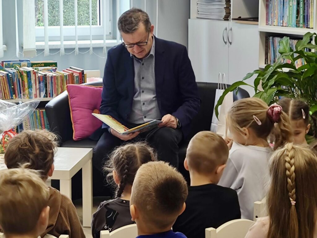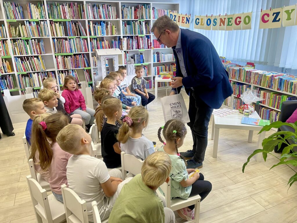 Tego dnia mieliśmy zaszczyt gościć w bibliotece Wiceburmistrza Gminy Milicz, pana Tomasza Chudego, który spotkał się z sześciolatkami z grupy „Kotki” z Przedszkola Samorządowego w Miliczu. Na początek każde dziecko otrzymało od naszego gościa kolorową zakładkę do książki – drobny, ale niezwykle miły upominek, który od razu wywołał uśmiechy na dziecięcych twarzach. Następnie pan Wiceburmistrz przeczytał maluchom najpiękniejsze wiersze Juliana Tuwima, m.in. „Lokomotywę”, „Rzepkę” i „Okulary”. Dzieci słuchały z przejęciem i radością, żywo reagując na pełne humoru i rytmu utwory.
