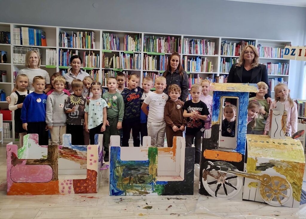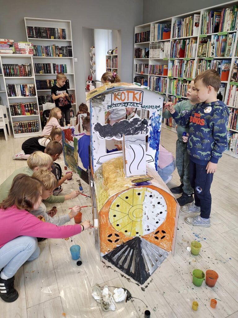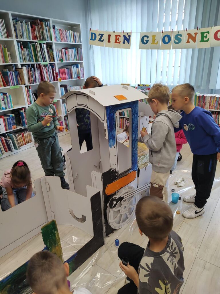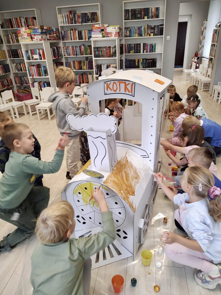 Po wspólnym czytaniu przyszedł czas na twórcze działanie. Zainspirowane wierszem o pędzącej maszynie, dzieci wspólnie kolorowały farbami ogromną lokomotywę z wagonami, która stała się barwnym symbolem naszego spotkania. Wspólna praca sprawiła dzieciom wiele radości i była pięknym dopełnieniem tego wyjątkowego dnia.