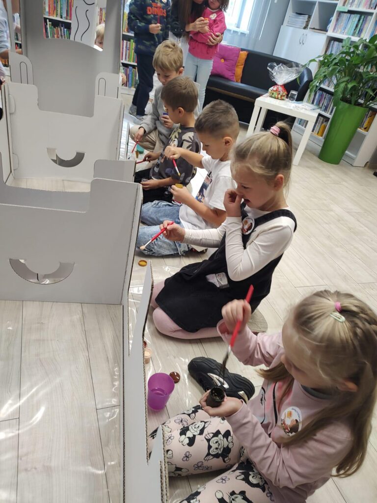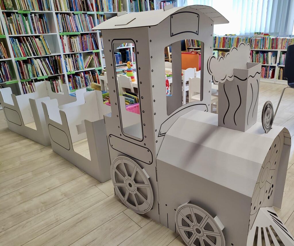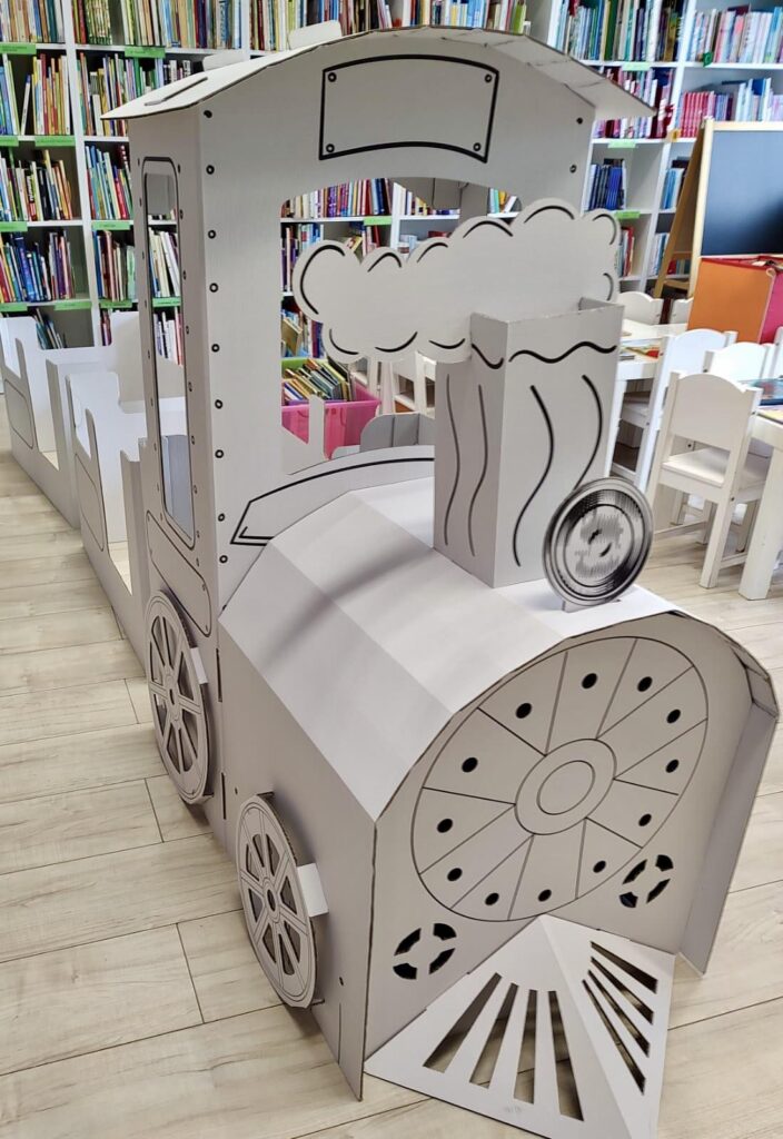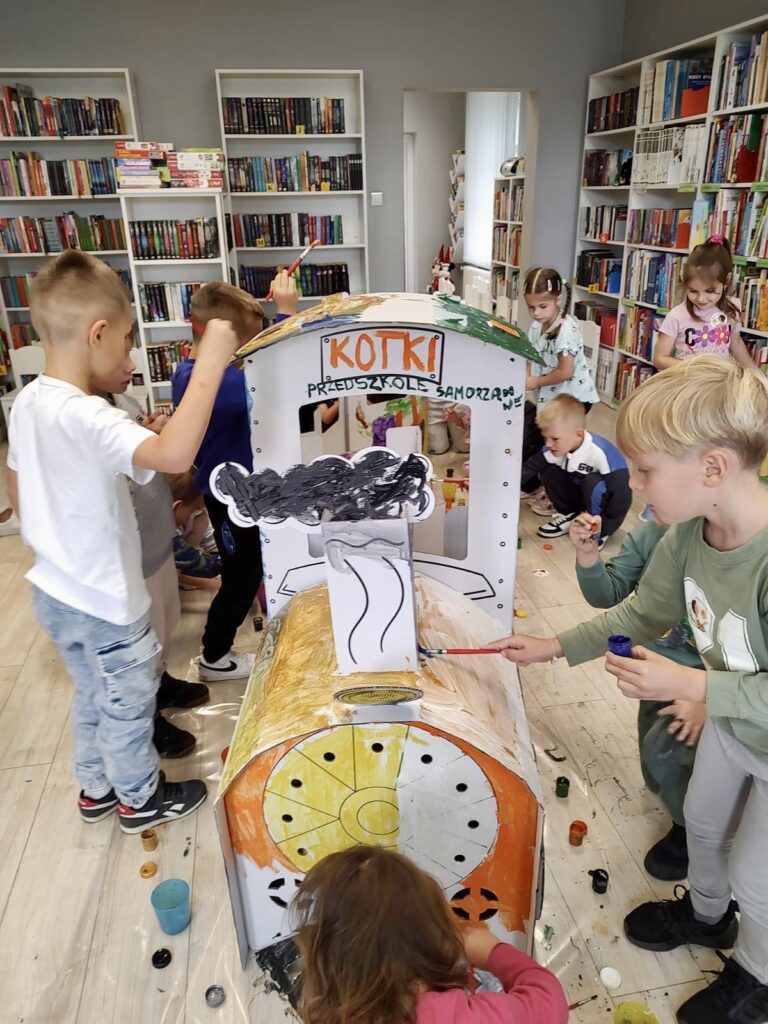 Po wspólnym czytaniu przyszedł czas na twórcze działanie. Zainspirowane wierszem o pędzącej maszynie, dzieci wspólnie kolorowały farbami ogromną lokomotywę z wagonami, która stała się barwnym symbolem naszego spotkania. Wspólna praca sprawiła dzieciom wiele radości i była pięknym dopełnieniem tego wyjątkowego dnia.