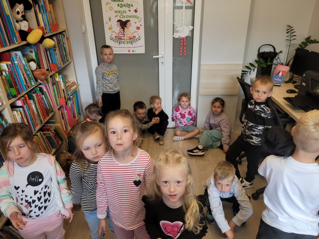 Tego dnia filię biblioteki w Sułowie odwiedziła grupa przedszkolaków, korzystając z pięknej, słonecznej pogody. Dla wielu z nich była to pierwsza wizyta, dlatego rozpoczęliśmy spotkanie od rozmowy o zasadach, jakie obowiązują każdego Czytelnika.