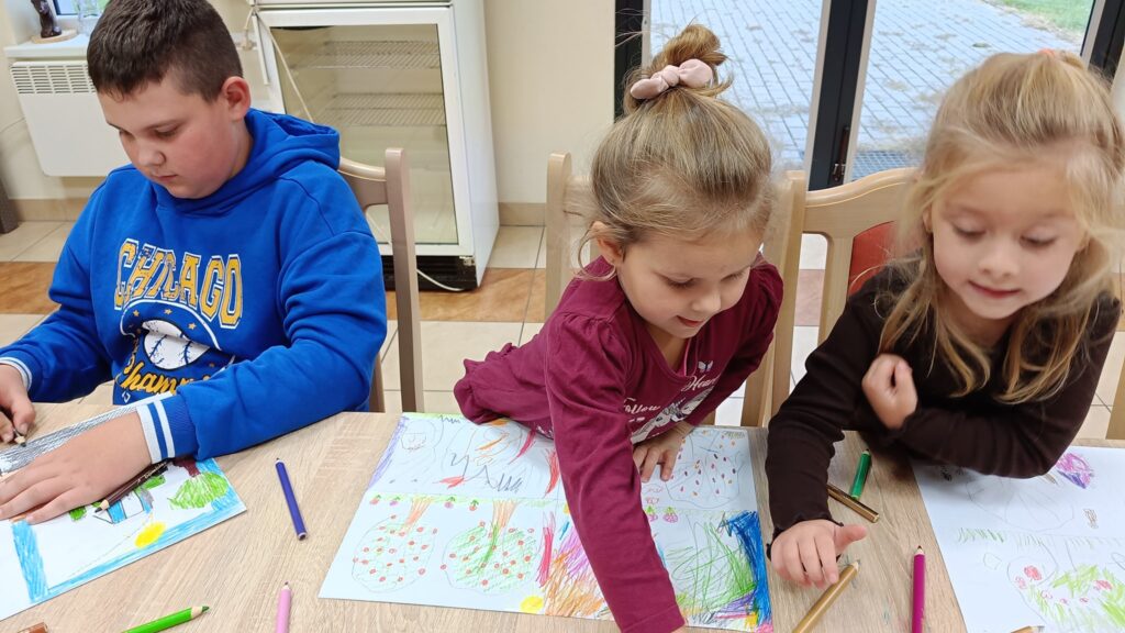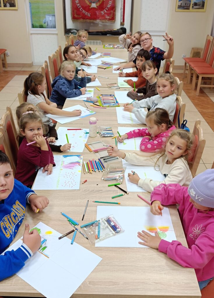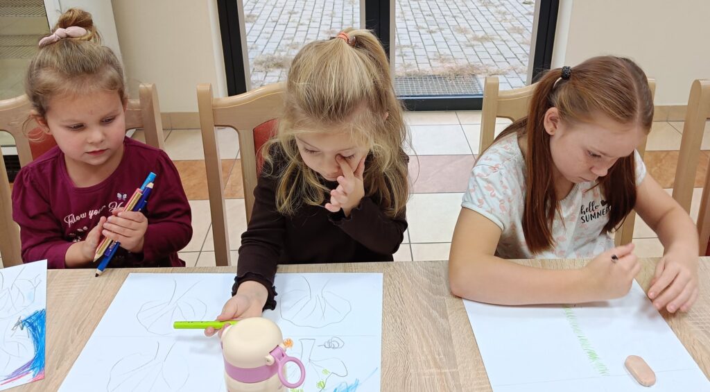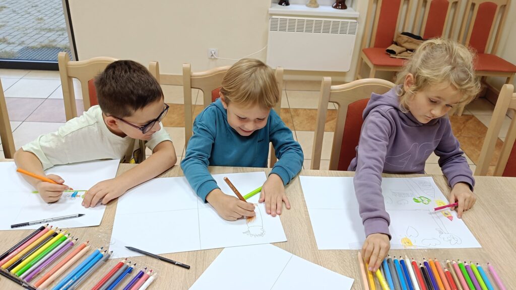 Druga część spotkania miała charakter plastyczny. Uczestnicy wykonali prace zatytułowane „Cztery pory roku” – kartki podzielone na cztery części, z których każda przedstawiała inną porę roku. Powstałe ilustracje tworzyły spójną, barwną opowieść – od wiosny aż po zimę. Dwoje młodych czytelników dodatkowo dopisało krótkie historie do swoich prac, co zrodziło pomysł na stworzenie książki. Kto wie, być może właśnie wśród uczestników rosną przyszli pisarze?