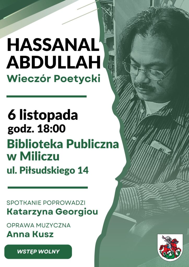 Biblioteka Publiczna w Miliczu serdecznie zaprasza na wyjątkowe spotkanie z poetą Hassanalem Abdullahem, które odbędzie się 6 listopada o godz. 18:00 w siedzibie biblioteki przy ul. Piłsudskiego 14.