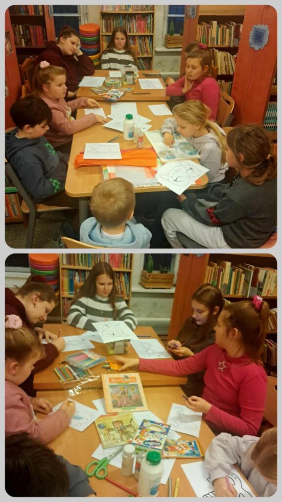Kolejnym punktem spotkania była część plastyczna. Dzieci z dużym zaangażowaniem przygotowywały karnawałowe maski, wycinając je i ozdabiając różnorodnymi materiałami. Powstały barwne, pomysłowe prace, a całe zajęcia upłynęły w radosnej i twórczej atmosferze. Serdecznie dziękujemy wszystkim uczestnikom za wspólnie spędzony czas i zapraszamy na kolejne zajęcia w filii bibliotecznej w Dunkowej.
