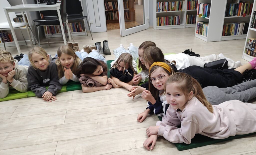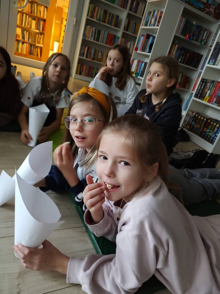 Uczniowie, wygodnie usadowieni na matach i delektujący się popcornem, z dużym skupieniem wsłuchiwali się w opowieść, wzbogaconą różnorodnym podkładem muzycznym oraz efektami dźwiękowymi. Taka forma kontaktu z literaturą pozwoliła dzieciom przeżyć historię w wyjątkowy, angażujący sposób.