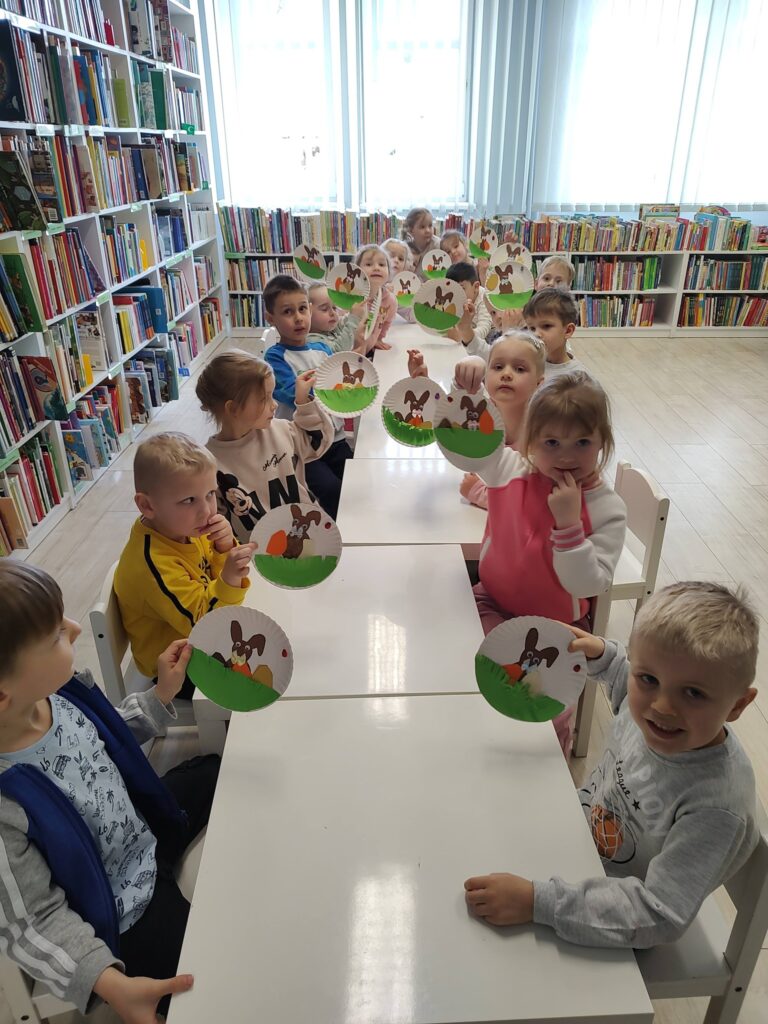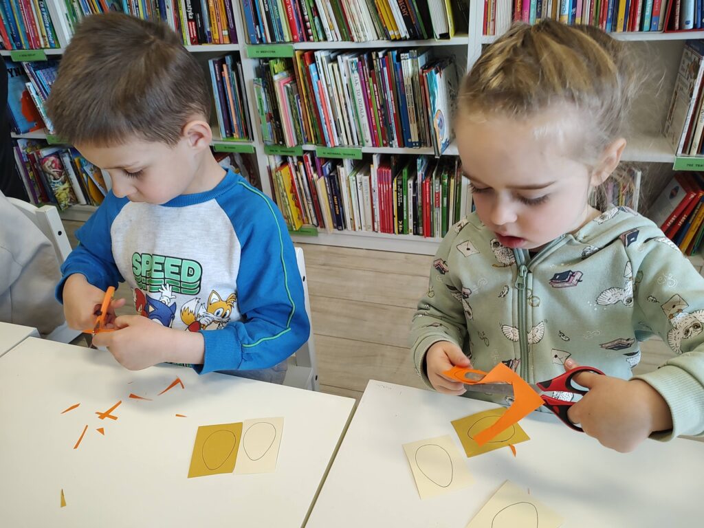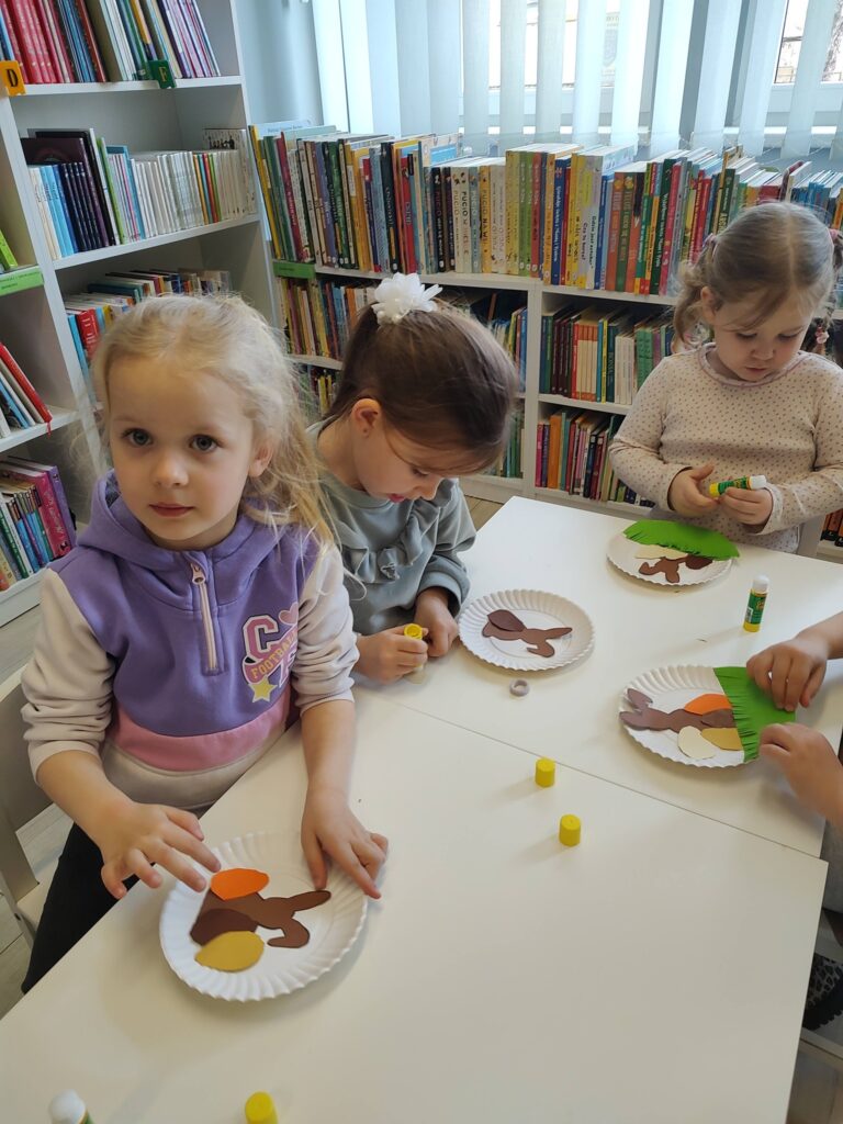 Od samego początku spotkania przedszkolaki zapowiadały, że najbardziej chcą oglądać kolorowe bajeczki. Zanim jednak przyszedł na to czas, z zaangażowaniem przystąpiły do pracy i wykonały piękne ozdoby wielkanocne, nawiązujące do zbliżających się świąt.
