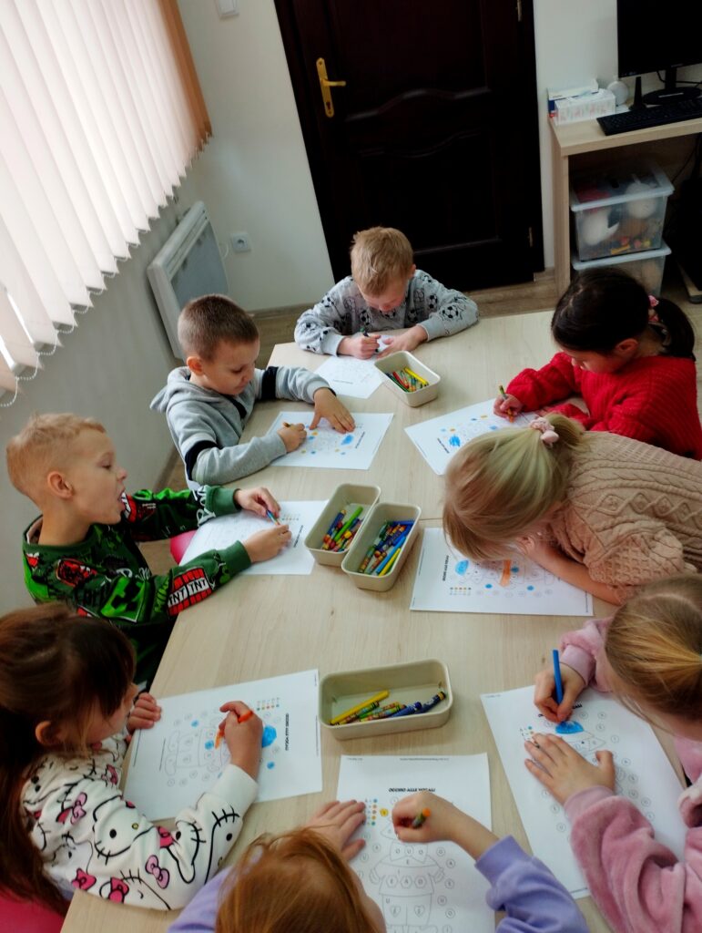 Kolejnym punktem spotkania była część plastyczna, która wywołała prawdziwe „wow”. Dzieci samodzielnie wykonały duże, kolorowe postacie klaunów. Z ogromnym zaangażowaniem przystąpiły do pracy, a efekty ich działań zachwyciły wszystkich uczestników.