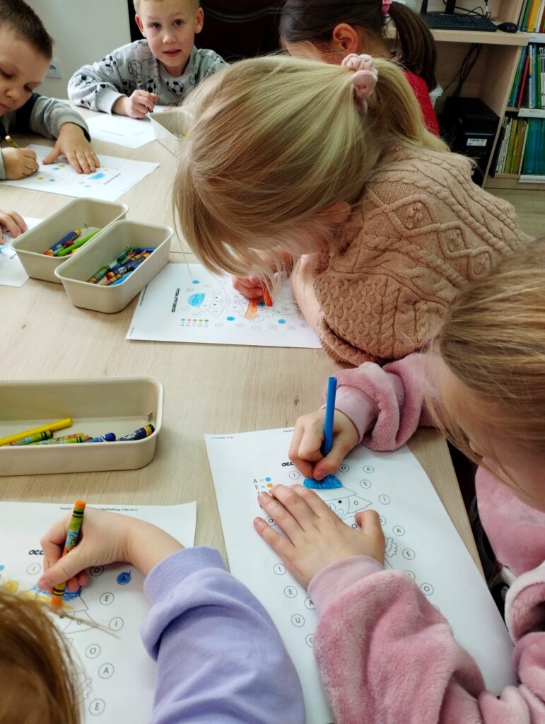Grupa „Żabki” rozpoczęła wizytę od zadania, które wymagało skupienia oraz znajomości liter i kolorów. Dzieci miały za zadanie pokolorować postać klauna według wskazówek, co okazało się ciekawym wyzwaniem. Przy tej okazji rozmawialiśmy również o pracy w cyrku oraz wysłuchaliśmy opowiadania „Łzy klauna”.